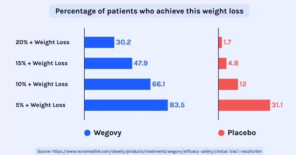 Clinical trials have shown that Wegovy treatment resulted in a statistically significant reduction in body weight compared to placebo after 68 weeks. One trial showed that people taking Wegovy had a mean change in body weight of 14.9% compared to 2.4% in the placebo group. The results also showed that, after 68 weeks, 83.5% of patients lost 5% or more of their body weight. In the placebo group, 31.1% of patients lost 5% or more of their body weight. Another clinical trial also showed a statistically significant reduction in body weight vs placebo. The National Institute for Health and Care Excellence (NICE) has recommended Wegovy for weight management for those living with obesity due to the highly positive trial results.